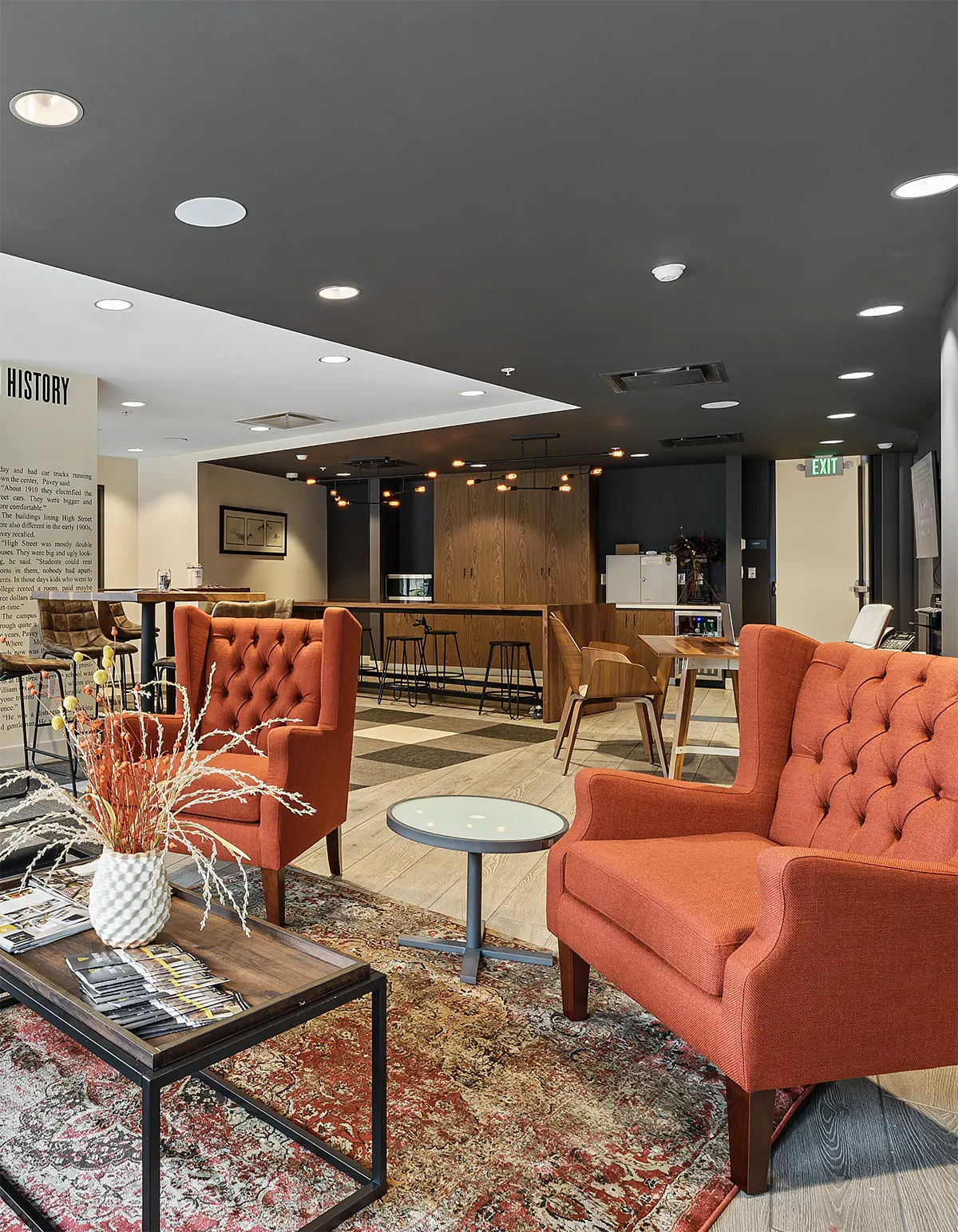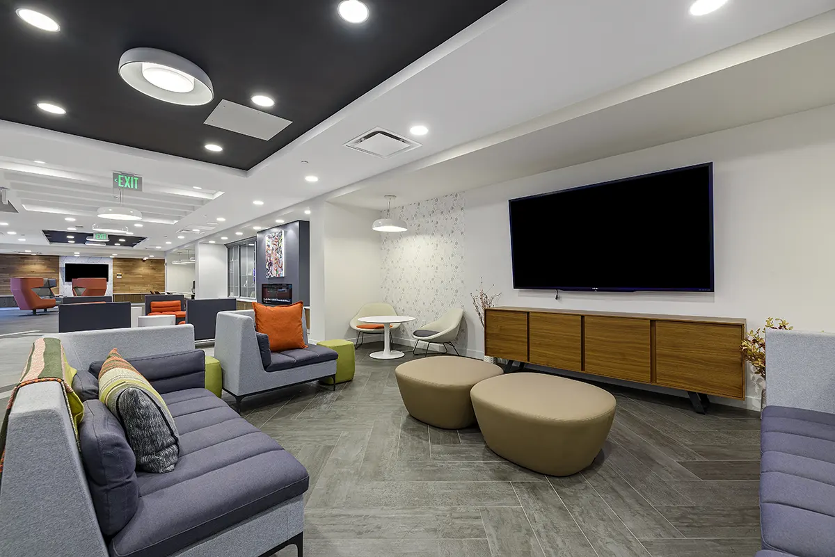 Huddle around the fire for a study session or a game night. Our community lounge space has a variety of areas for you to relax.